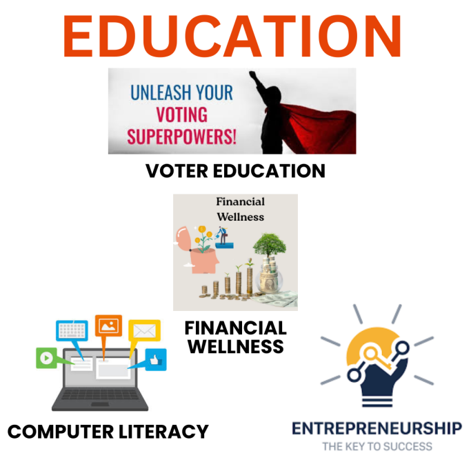 Through our voter education initiatives, we equip citizens with the information they need to make informed decisions at the ballot box by educating them on their voter rights and voting processes, thereby ensuring their voices are heard. In today’s digital age, our digital literacy programs are paramount. We teach essential technology skills that open doors to new employment opportunities and facilitate better access to information and services. Additionally, our focus on financial wellness prepares participants to manage their resources effectively and plan for a secure future. We offer workshops on budgeting, saving, and investing to empower individuals to make sound financial choices. Lastly, we encourage entrepreneurship by providing aspiring business owners with the knowledge and tools necessary to launch and sustain their own ventures.