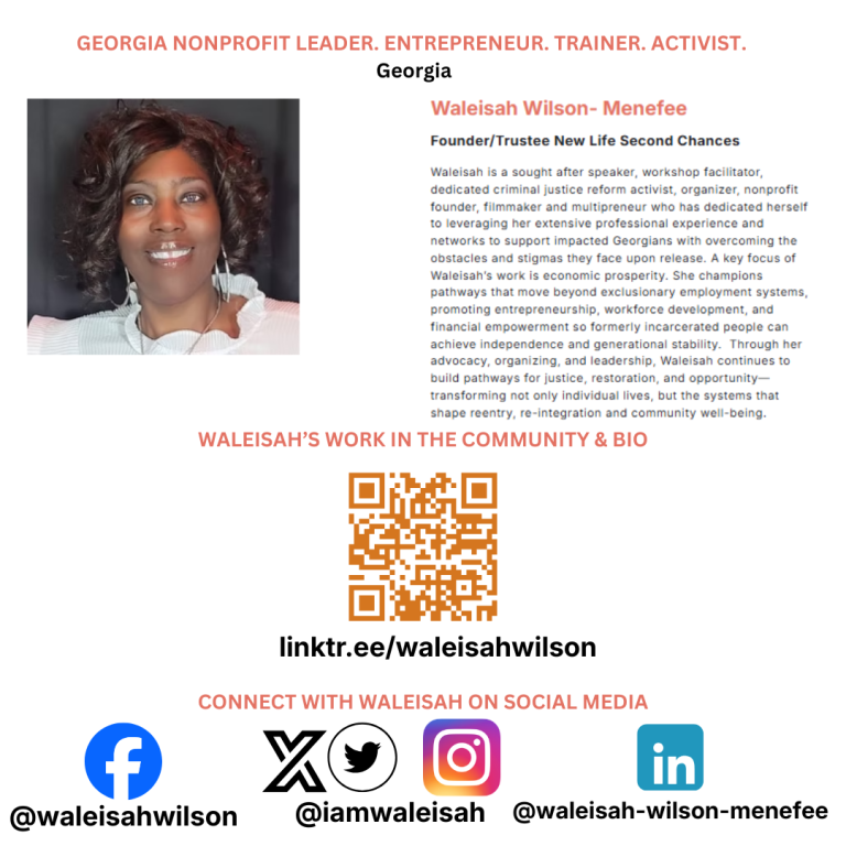 Because of her amazing work through this organization and as the owner of Taking Charge Consulting, LLC. as a workshop facilitator, her commitment of leveraging her extensive professional experience and networks to support impacted Georgians with overcoming the obstacles and stigmas they face upon release and because of her work that focuses on advocating for economic prosperity and financial empowerment via entrepreneurship and workforce development, FSA saw fit to honor Waleisah's work in championing pathways that move justice impacted people beyond exclusionary employment systems so they can achieve independence and generational stability.