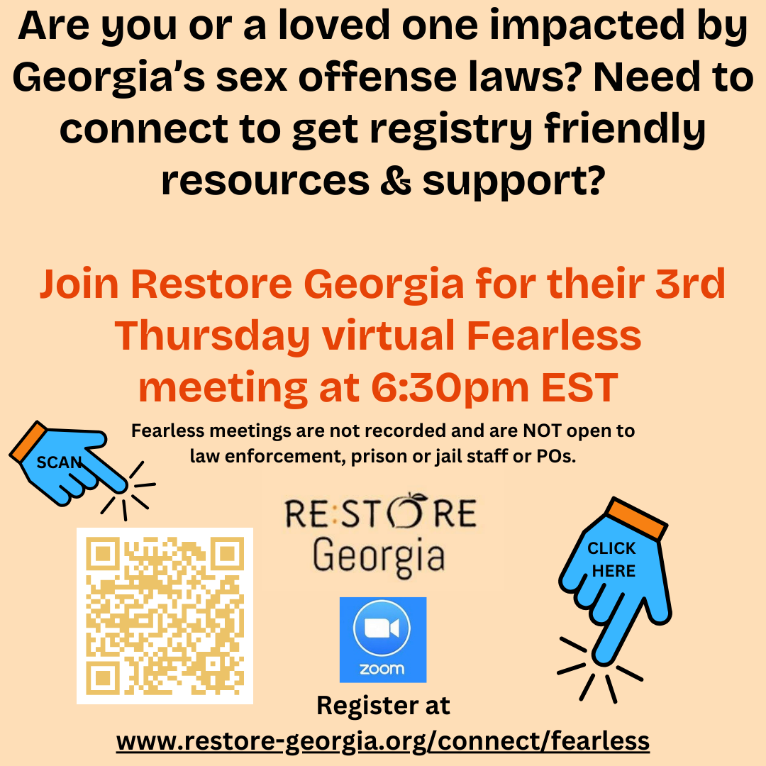 If you or your loved one is impacted by Georgia's sex offense laws and in need of resources and a supportive community of others experiencing the same challenges of navigating reentry on the registry, please register to attend these free, virtual, safe and non-judgemental meetings. They are not recorded and law enforcement, prison & jail staff and POs are not allowed.