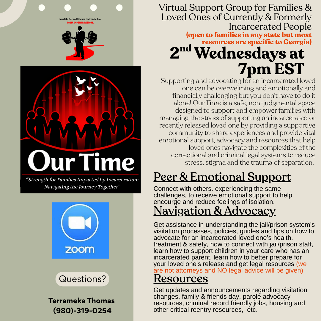 Our Time is a safe, non-judgmental space designed to support and empower families with managing the stress of supporting an incarcerated or recently released loved one by providing a supportive community to share experiences and provide vital emotional support, advocacy and resources that help loved ones navigate the complexities of the correctional and criminal legal systems to reduce stress, stigma and the trauma of separation.